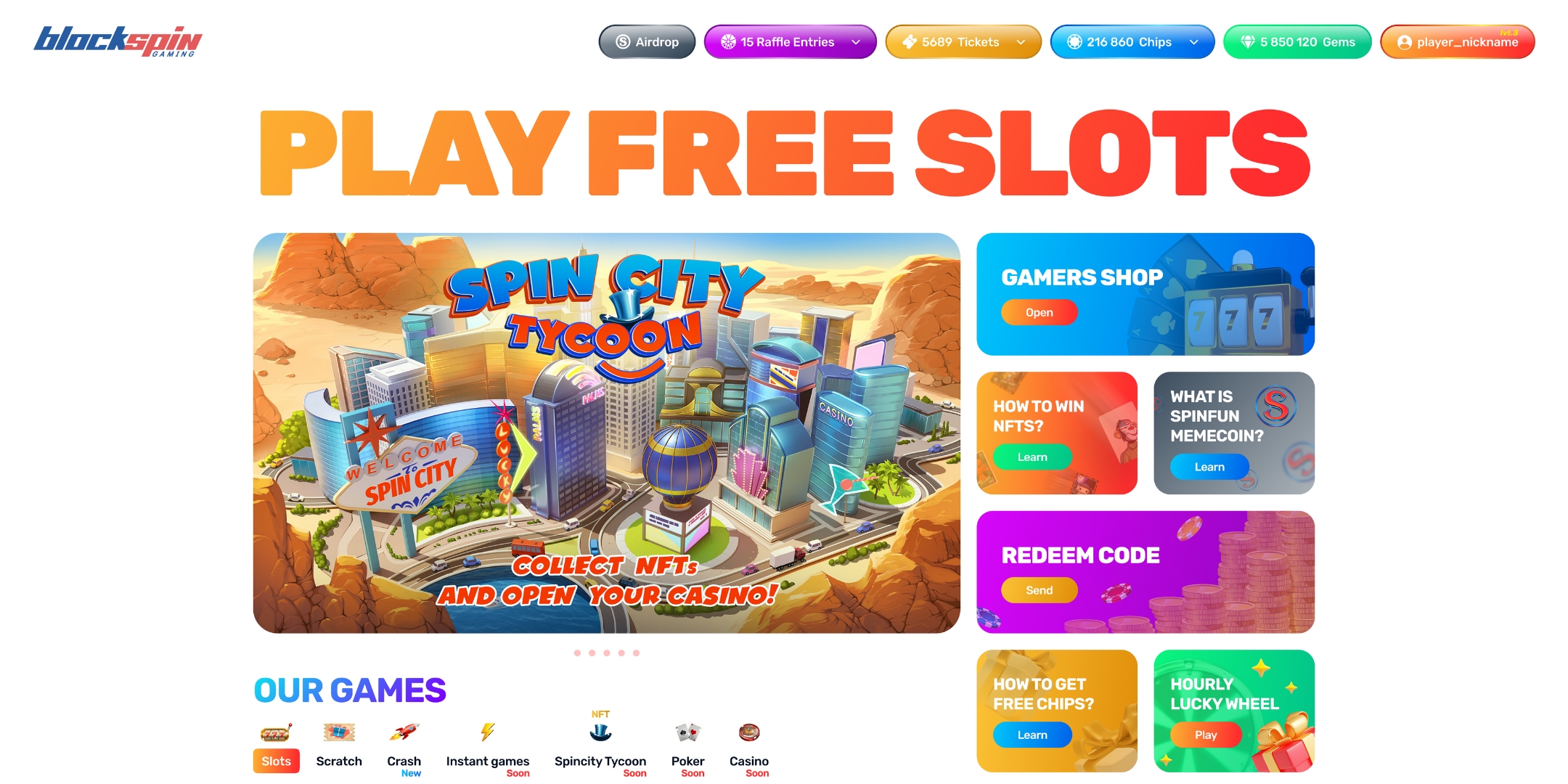 BlockSpinGaming is a groundbreaking free-to-play entertainment platform at the intersection of social casino, WEB3 innovations, and GAMEFI. Players can win NFT rewards, mine the platform token $SPINFUN, win Bitcoin rewards, and build digital empires with various NFT games to be released. The platform also incorporates Proof-of-Play mechanics to reward real gameplay activity and Buy-to-Burn systems that sustain long-term token value and player incentives.
