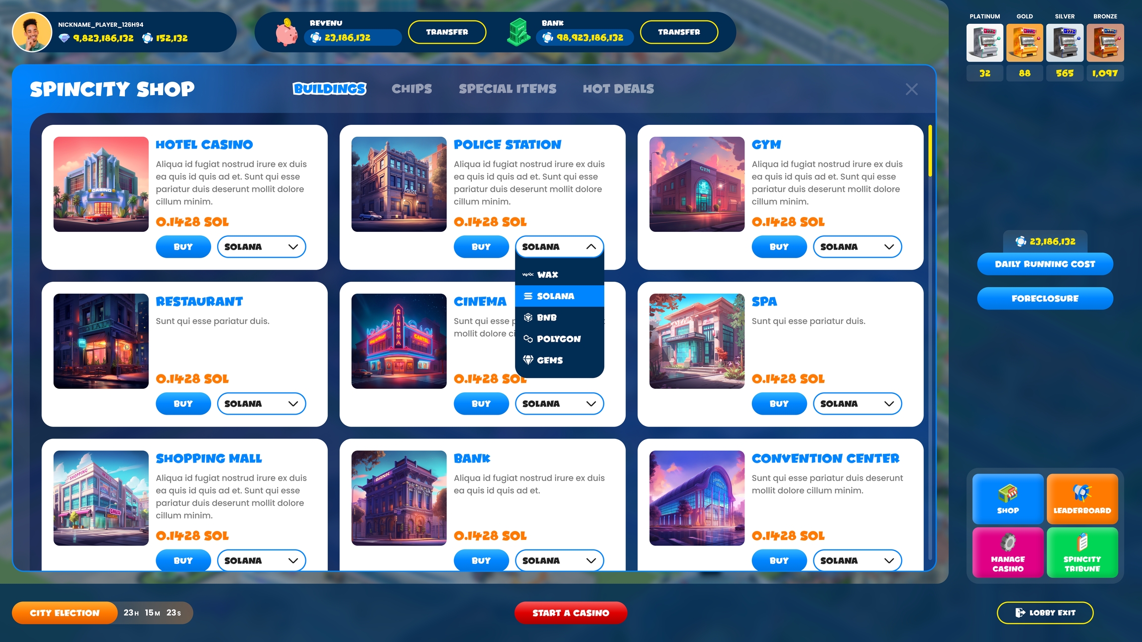 호텔 카지노를 하나 더 짓기 위해 추가 토지를 구입하세요.